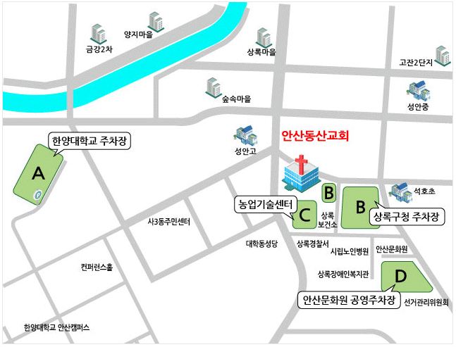 (구) 상록구청 주차장과 (신)상록구청 주차장에서 교회까지 도보로 1~2분정도 걸어오시면 교회에 도착하실 수 있습니다.
